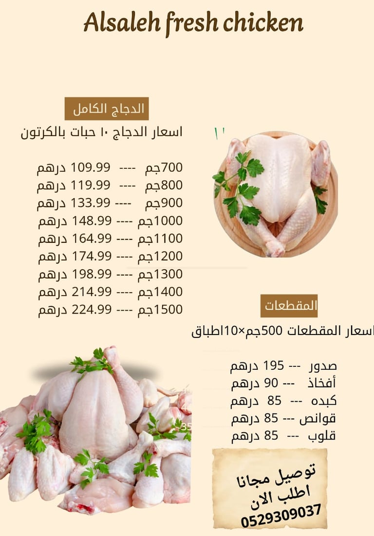 توصيل مجاني وسريع لدجاج كامل ومقطع بجودة عالية